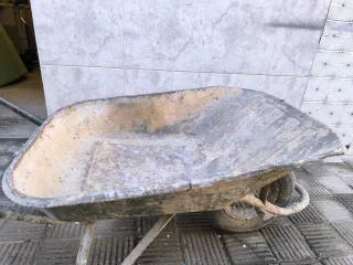Carretilla de mano utilizada en trabajos de construcción y albañilería. Su diseño permite transportar materiales de forma eficiente. - Cubeta metálica resistente. - Rueda para facilitar el desplazamiento. - Mangos para su sujeción y empuje.