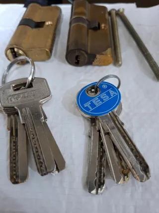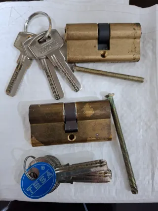 Se venden dos bombines de cerradura, uno de la marca Tesa y otro de la marca Okariz. Incluyen 3 llaves cada uno, el precio es por los dos si quiere solo uno son 8 euros.