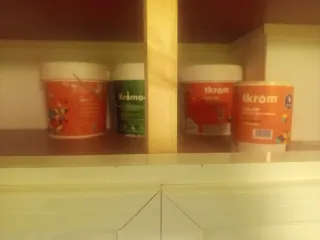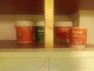Lote de botes de pintura de diferentes marcas y colores. - Bote de pintura blanca Tkrom Color. - Bote de pintura beige Tkrom. - Bote de pintura verde Kromag. - Bote de pintura blanca