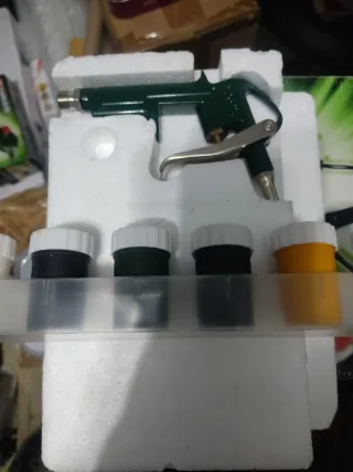 Set de aerografía Parkside PABK 60 A1, a estrenar. - Potencia de conexión: 300 W. - Presión de trabajo: 3 bar. - Caudal de salida: aprox. 15 l/min. - Incluye 1 pistola para aerografía (Single Action), 1 manguera para aerografía (aprox. 1.6 m), 2 recipientes de vidrio para mezclas, 6 botellas de pintura y 3 adaptadores de boquilla.