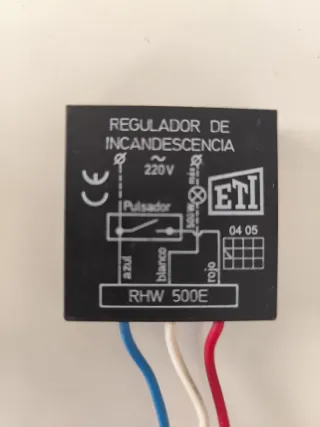 Regulador de incandescencia ETI, modelo RHW 500E. - Potencia máxima de 500W. - Voltaje de 220V. - Conexiones para pulsador, azul, blanco y rojo. Todas las características en foto. Mirar mi perfil, tengo varios.