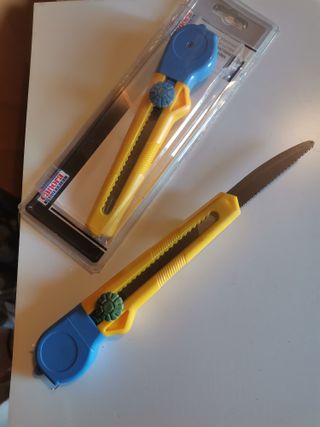 Cúter multiusos con tres funciones: hoja de sierra, cuchilla y metro. Ideal para diversas tareas. - Mango de plástico amarillo y azul. - Mecanismo de rueda para ajuste de hoja. - Hoja de sierra dentada. - Cuchilla retráctil. - Flexometro 2 mt