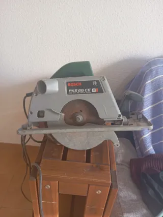 Sierra circular de la marca Bosch, modelo PKS 66 CE. Herramienta eléctrica para cortes precisos. - Diseño robusto y ergonómico. - Protector de hoja. - Empuñadura auxiliar para mayor control.