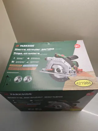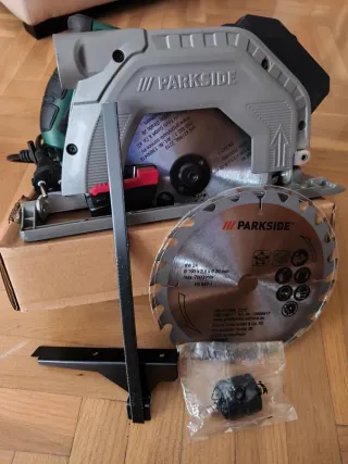 Sierra circular portátil de la marca Parkside. Sin abrir, nuevo a estrenar - Potencia de conexión: 1350 W - Velocidad de giro en vacío: 2200-4700 rpm - Profundidad de corte a 45°: máx. 44 mm - Profundidad de corte a 0°: máx. 65 mm - Ángulo de corte: 0-45° - Material de construcción: ligero - Incluye accesorios