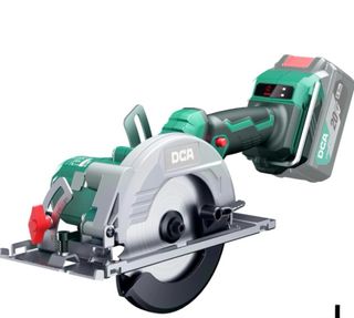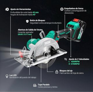 Sierra circular inalámbrica de la marca DCA. - Batería de 20V y 4.0Ah incluida. - Diseño ergonómico para un mejor agarre. - Indicador de carga de batería.