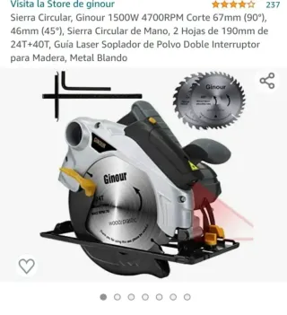 Sierra circular Ginour de 1500W, a estrenar. Sin desprecintar siquiera. - Potencia: 1500W. - Modelo: TPK-PT001. - Incluye 2 discos.