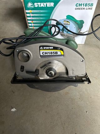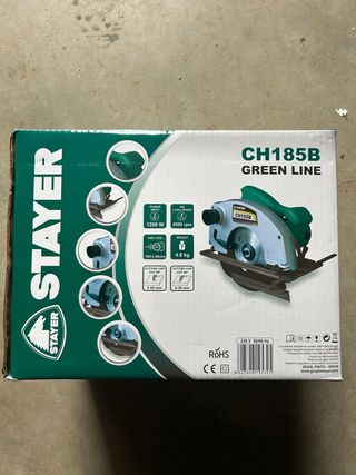 Sierra circular Stayer CH185B de la línea Green Line. Herramienta potente y versátil para cortes precisos. Solo se ha estrenado. - Potencia: 1200 W - Velocidad sin carga: 4500 rpm - Diámetro del disco: 185 x 20 mm - Peso: 4.8 kg - Capacidad de corte a 90º: 0-55 mm - Capacidad de corte a 45º: 0-38 mm