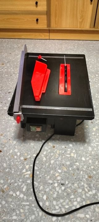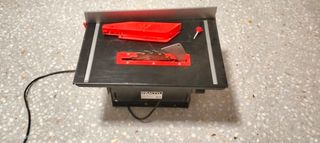 Sierra circular de mesa para trabajos de carpintería. Cuenta con una superficie de madera y una base robusta. - Hoja de sierra expuesta. - Interruptor de encendido/apagado visible. - Enchufe y cable de alimentación incluidos.