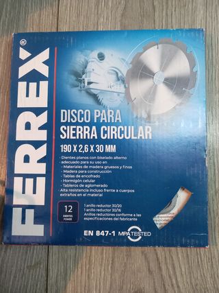 Disco para sierra circular Ferrex de 190mm de diámetro, con 12 dientes. Ideal para madera, aglomerado y hormigón celular. Incluye 1 anillo reductor 30/20 y 1 anillo reductor 30/16. El disco se ve nuevo y en perfecto estado.