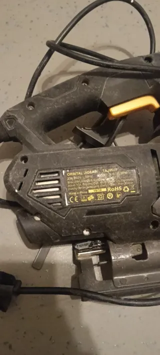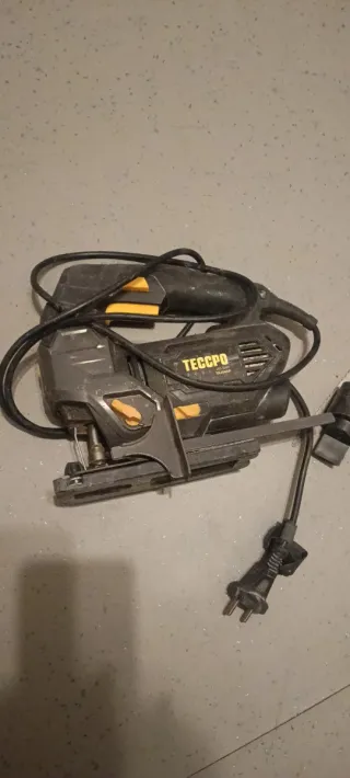 Sierra de calar eléctrica. - Color negro y amarillo. - Incluye cable de alimentación. Tipo de Herramienta: ORBITAL JIGSAW (Sierra de Calar Orbital). Modelo: TAJ01P. Marca: TECCPO (visible en la primera imagen). Potencia/Especificaciones: La etiqueta indica 230V, 50Hz, y un consumo de 6.0A.