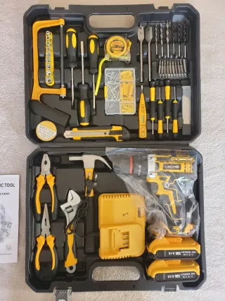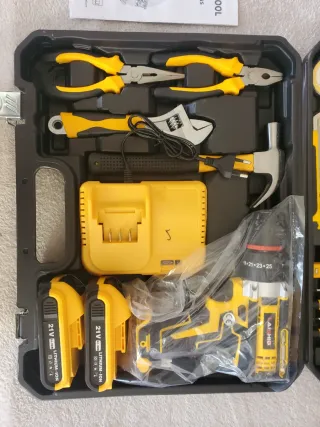 Completo kit de herramientas multiusos con taladro atornillador. - Incluye taladro inalámbrico. - Baterías de litio de 21V. - Cargador de batería. - Juego de brocas y puntas. - Cinta métrica. - Sierra de arco. - Destornilladores. - Alicates. - Llave inglesa. - Cúter. - Detector de voltaje. - Tornillos y tacos. Completamente nuevos cualquier duda preguntar..