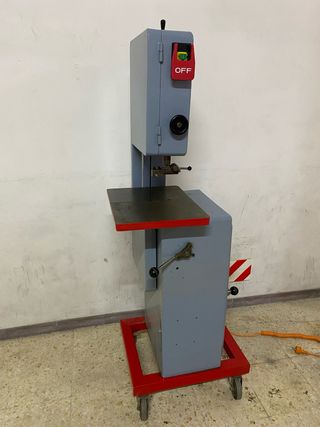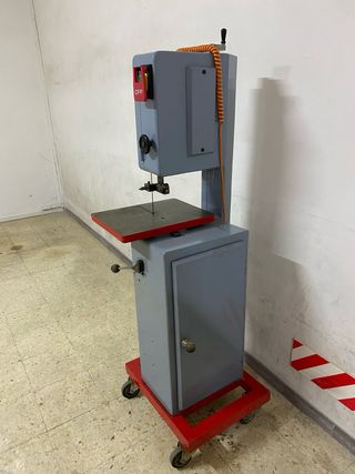 Sierra de cinta de uso industrial, ideal para trabajos de corte en matriceria carpinteria para diversidad de materiales. Su diseño robusto y su base con ruedas facilitan su movilidad y estabilidad. - Dispone de dos velocidades mediante caja de cambios - Arranque parada de emergencia. - Estructura metálica gris. - Mesa de corte con borde rojo. - Interruptor de encendido/apagado rojo y verde.