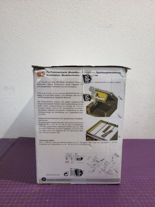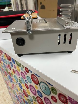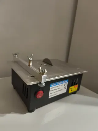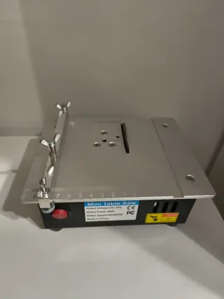 Mini sierra de mesa compacta y portátil. - Carte de precisión ideal para modelismo - Voltaje nominal: DC-24V - Potencia nominal: 96W - Velocidad nominal: 5000 RPM - sierra ajustable en altura - dos accesorios para guiar el corte - con salida pra aspiradora - usado una unica vez