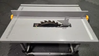 Mesa de sierra compacta, ideal para trabajos de carpintería en casa. Incluye varios accesorios para mayor versatilidad. - Sierra circular integrada. - Guía de corte ajustable. - Protector de hoja. - Empujador de madera. - Transportador de ángulos.