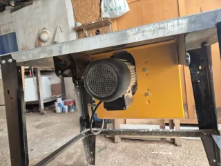Sierra circular de mesa industrial Motor muy potente En la placa se ve: • 2.9 kW • 3000 rpm • trifásico 400V La mesa y el chasis que se ven son: • acero grueso • patas robustas • motor colgante Esto es típico de maquinaria de carpintería profesional. Disco grande usa disco grande 350 mm Eso permite: • cortar tablas gruesas • cortar vigas • más precisión. Las domésticas su - Motor trifásico. - Estructura robusta de metal rojo. - Protector de motor con rejilla. Si venis a buscarla 400 euros