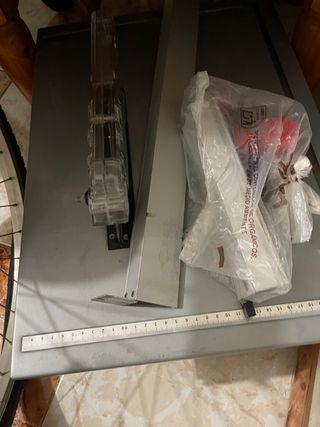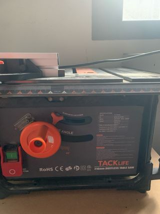 Sierra de mesa Tacklife con disco de 210mm. Ideal para trabajos de carpintería. - Disco de sierra incluido. - Guía de inglete. - Protector de hoja.( lo tiene pero no le hice foto porque no lo tengo montado - Bolsa aspirador. Tiene roto el agarre de la barra de corte. (Ultima foto)