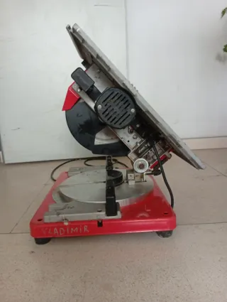 Sierra ingletadora con base de mesa, ideal para cortes precisos. Envio gratis en Madrid. - Base de color rojo. - Disco de corte visible.