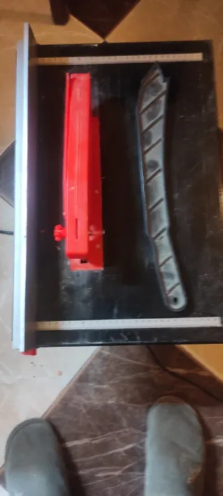 Sierra de mesa para realizar cortes precisos en diversos materiales. Ideal para trabajos de carpintería y bricolaje. - Base roja robusta. - Motor eléctrico negro. - Guía de corte metálica.