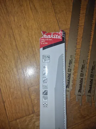 Lote de cinco hojas de sierra de sable bimetálicas de la marca Makita. Original lote de 5 unidades - Hojas de sierra de sable. - Material bimetálico. - Marca: Makita. En laa fotos esta la referencia y todo lo necesario saber