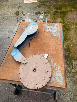 Sierra de mesa con disco de corte incluido. La superficie de trabajo es de metal con un acabado oxidado y presenta restos de pintura azul. - Disco de corte con ranuras. - Protector de disco azul.