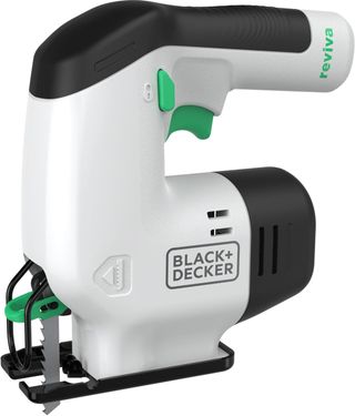 Sierra caladora de la marca Black+Decker, modelo Reviva. Diseño en color blanco y negro con detalles en verde. - Mango ergonómico. - Botón de encendido y seguro. - Base de apoyo. - Hoja de sierra incluida.