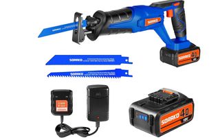 Sierra sable eléctrica inalámbrica SORAKO de 18V, ideal para trabajos de corte. - Incluye dos hojas de sierra: una para metal y otra para madera. - Viene con una batería de 4.0Ah y un cargador. - Diseño ergonómico para un mejor agarre.