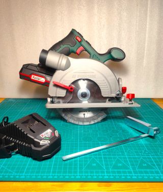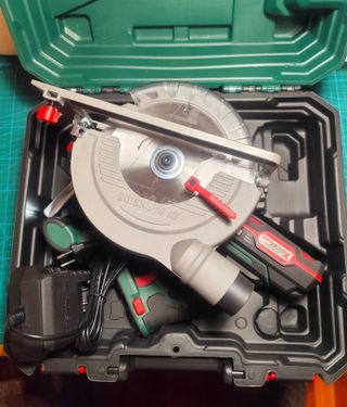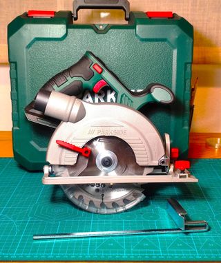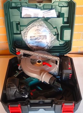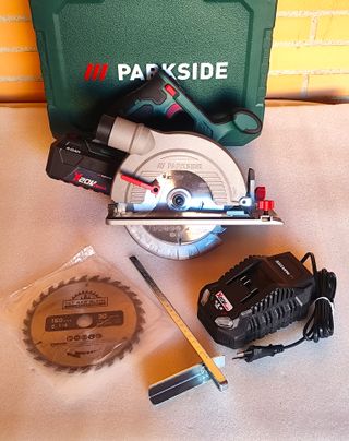 Sierra circular de mano PARKSIDE 20v X20 Team, con 1 batería de 4Ah de iones de Litio, cargador rápido de 4,5Ah, hoja de 24 dientes, guía lateral, adaptador aspirador, llave Allen y maletín rigido con asa. Solo comprobada. Añado hoja XCAM compatible de 16cm y 30 dientes, nueva. MI PRECIO MÍNIMO.