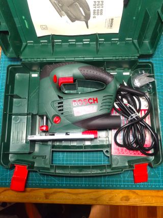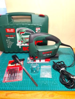 Sierra de calar BOSCH PST 680 E modelo electronico, en su maletín rigido. En perfecto estado, muy poco usada. Se incluyen 10 hojas de sierra Bosch en un blister y 1 en el porta hojas de la base de la sierra. Es mi precio mínimo.