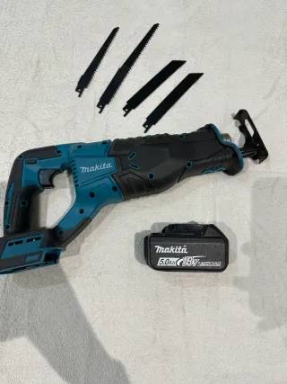 Sierra de sable inalámbrica Makita en color azul y negro. Incluye batería. - Sierra de sable Makita - Batería Makita 18V 5.0Ah - 4 hojas de sierra