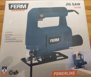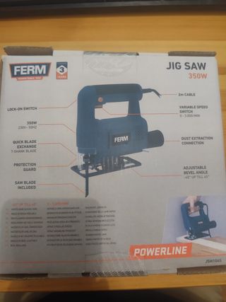 Sierra de calar marca Ferm, modelo Powerline de 350W. - Incluye sierra de calar, 1 llave hexagonal, 1 hoja de sierra para madera y 1 conexión para aspiración de polvo. - Garantía de 3 años.