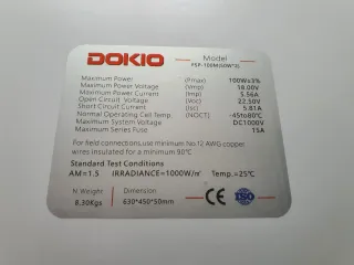 Panel solar DOKIO modelo FSP-100M, con una potencia de 100W. - Potencia máxima: 100W±3% - Voltaje de potencia máxima (Vmp): 18.00V - Corriente de potencia máxima (Imp): 5.56A - Voltaje de circuito abierto (Voc): 22.50V - Corriente de cortocircuito (Isc): 5.81A - Temperatura de operación: -45 a 80°C - Voltaje máximo del sistema: DC1000V - Fusible en serie máximo: 15A - Peso: 8.30 Kgs - Dimensiones: 630*450*50mm