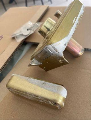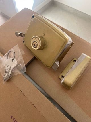 Cerradura de sobreponer para puerta, diseñada para instalación en el lado izquierdo. Incluye seis llaves (3 originales y 3 copias) - Color dorado. - Mecanismo de seguridad. - Placa de cierre.