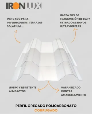 Panel de policarbonato corrugado de la marca IRONLUX. - Indicado para invernaderos, terrazas y solárium. - Hasta 90% de transmisión de luz. - Filtrado de rayos ultravioletas. - Ligero y resistente a impactos. - Garantizado contra amarilleamiento.