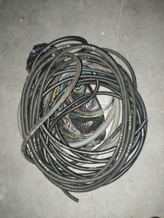 Se vende un rollo de cable eléctrico de color negro. El cable está enrollado y parece ser de un material resistente. - Cable de luz. - Color negro. - Enrollado.
