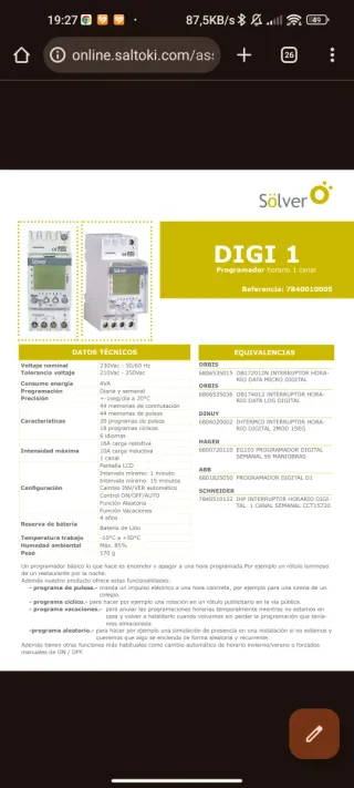 Reloj programador horario Sölver Digi-. - Modelo: Digi-1 - Alimentación: 230-240V~ 50-60Hz - Corriente nominal: 10A-16A - Programación diaria y semanal - Sin estrenar, nuevo en su caja, incluye manual. - PVP tarifa: 134€ Ideal para controlar iluminación exterior, rótulos luminosos, extractores, termos eléctricos, etc.