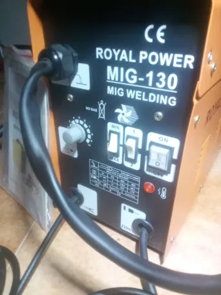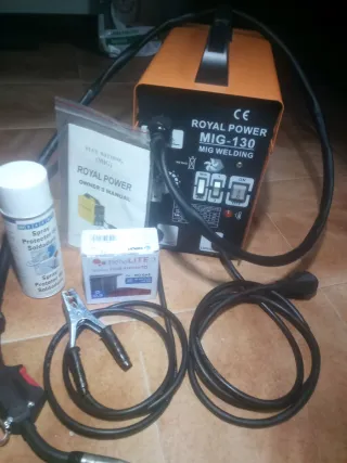 Soldadora de hilo (MIG) Royal Power MIG-130,casi sin usar,con su caja y manual de instrucciones, costó 150€ y añado spray protector de soldadura + rollo de hilo de calidad superior al q trae de serie (solo estás dos cosas costaron más de 28€). Envío rápido 14€ previo pago o venta por wallapop.NO NEGOCIO NADA NI ATIENDO OFERTAS