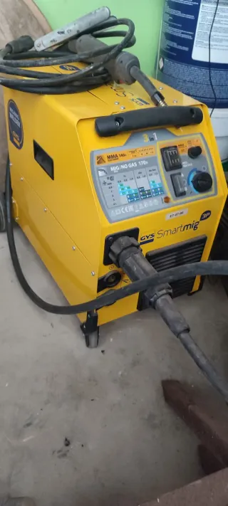 Soldadora GYS Smartmig 3P en color amarillo. - Función MMA 140A. - Función MIG/NO GAS 170A. - Incluye pinza de masa y portaelectrodos. - Ruedas para facilitar el transporte. Apenas usada un par de veces...se vende por eso... Pesa lo suyo, por eso ver cuanto vale el envío antes