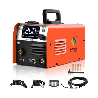 Soldadora HITBOX TIG 200 A IGB en color naranja. Incluye accesorios. - Manguera de gas. - Pinza de masa. - Antorcha TIG. - Porta electrodos.