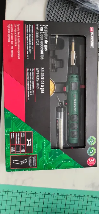 Soldador de gas Parkside 3 en 1 con accesorios. Incluye cartucho de gas combustible. - Temperatura de la llama: máx. 1300 °C - Temperatura del aire caliente: máx. 600 °C - Temperatura de la punta de soldadura: máx. 450 °C - Incluye sopletes, cannello y pistola de aire caliente.