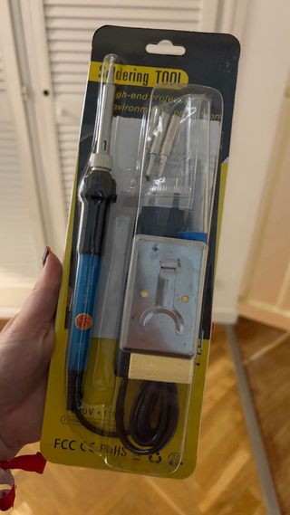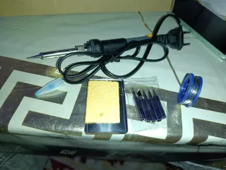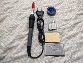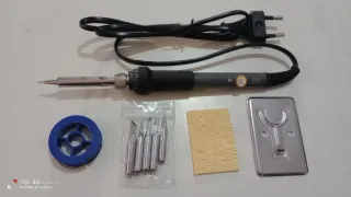 Kit de soldador de estaño con accesorios. - Soldador - Incluye 5 puntas de soldador intercambiables. - Esponja para limpieza. - Soporte para soldador. Estaño Funciona perfectamente esta nuevo