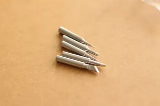 Conjunto de puntas de repuesto para soldador de estaño. Son de metal plateado y vienen en diferentes formas para adaptarse a diversas tareas de soldadura. - Puntas de metal plateado. - Variedad de formas para diferentes usos.