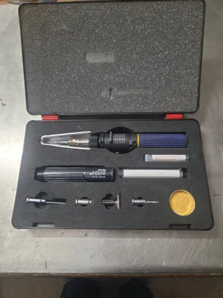 Soldador de estaño TopCraft, también funciona como pirograbador, en buen estado, utilizado unas pocas veces, soldador a gas, (el mismo que utilizan los mecheros). Se vende con todo lo que se ve en la foto.