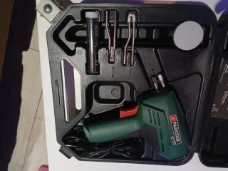 Equipo de soldadura de la marca Parkside, ideal para trabajos de electrónica y reparaciones. - Incluye soldador, base de apoyo y termómetro digital. - Diseño ergonómico y fácil de usar. - Indicador de temperatura en pantalla. - Hasta 400 grados regulables - dos puntas extras Usado pero en perfecto funcionamiento