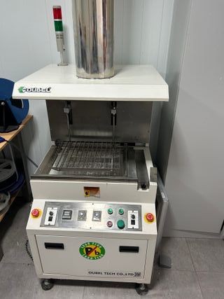 Máquina de soldadura por ola de estaño de la marca OUBEL. - Modelo: OUBEL TECH CO., LTD - Diseño Lead Free (sin plomo). - Panel de control con indicadores y botones. - Incluye torre de señalización (rojo/verde). - Base con ruedas para fácil movilidad.