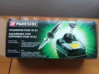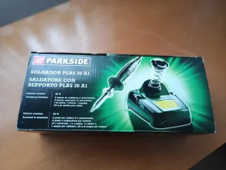 Set de soldador de estaño Parkside. - Modelo: PLBS 30 A1 - Potencia: 30W - Incluye soporte y accesorios.Donde el soporte de estaño tiene un agujero pequeño por la parte de atrás no afecta a su funcionamiento solo es estética.Se.ha puesto foto del agujero pequeño.Incluye estaño,puntas soporte,soldador ,caja, instrucciones.