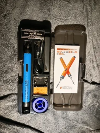 Kit de soldador portátil con diseño ergonómico y alimentación por USB. - Soldador azul con indicador LED. - Incluye caja de almacenamiento. - Viene con cable de carga USB. - Incluye soporte para soldador con esponja. - Incluye estaño para soldar. - Incluye flux de soldadura.