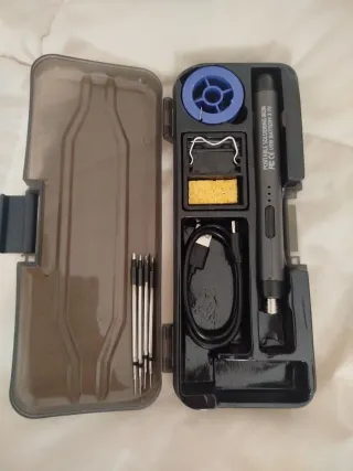 Kit de soldador de estaño portátil con alimentación USB. Está nuevo, solo se ha usado una vez para hacer una soldadura. Incluye 4 puntas distintas. Va perfecta, la cargas y te lo puedes llevar a cualquier sitio. Se hacen envíos, más productos en mi perfil. - Incluye soldador, puntas de repuesto, soporte, esponja y carrete de estaño. - Cable de carga USB incluido. - Diseño compacto y fácil de transportar.