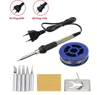 Kit de soldador de estaño con varios accesorios para tus proyectos. - Soldador de 220V y 60W. - Juego de 5 puntas de soldador. - Soporte metálico para soldador. - Esponja limpiadora. - Rollo de estaño.