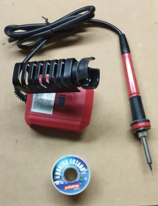 Soldador de estaño con mango de plástico rojo y cable de alimentación. - Mango de plástico de color rojo. - Punta de soldadura metálica. - Cable de alimentación negro.