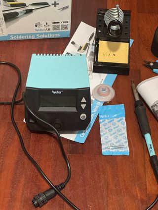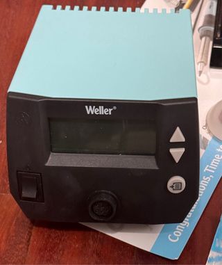 Estación de soldadura Weller con control digital de temperatura. - Pantalla LCD. - Botones de control. - Conector para soldador. Incluye manos amigas, malla para desoldar, esponja de limpieza, estaño y cortador de alambre. Tiene muy poco uso.